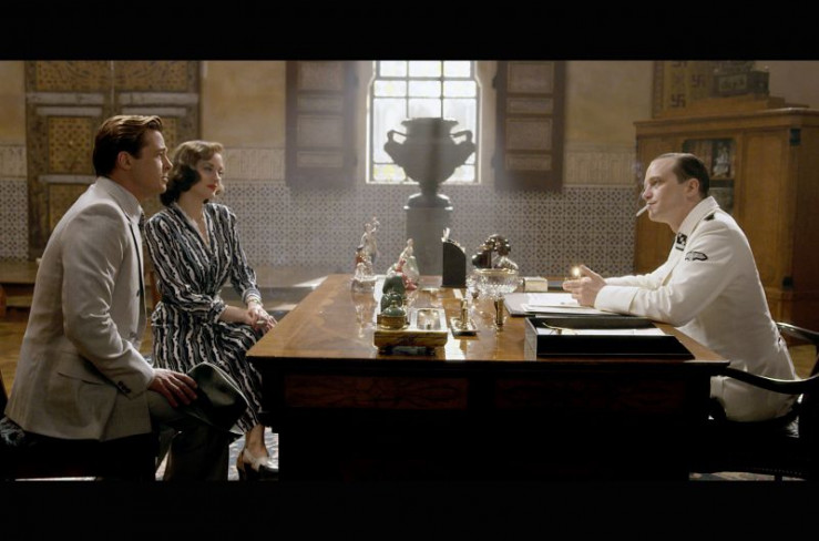 Als Ehepaar getarnt sollen Max (Brad Pitt, li.) und Marianne (Marion Cotillard, 2.v.l.) den deutschen Botschafter ausschalten. Dafür müssen sie Hauptsturmführer Hobar (August Diehl, re.) von ihrer neuen Identität überzeugen.