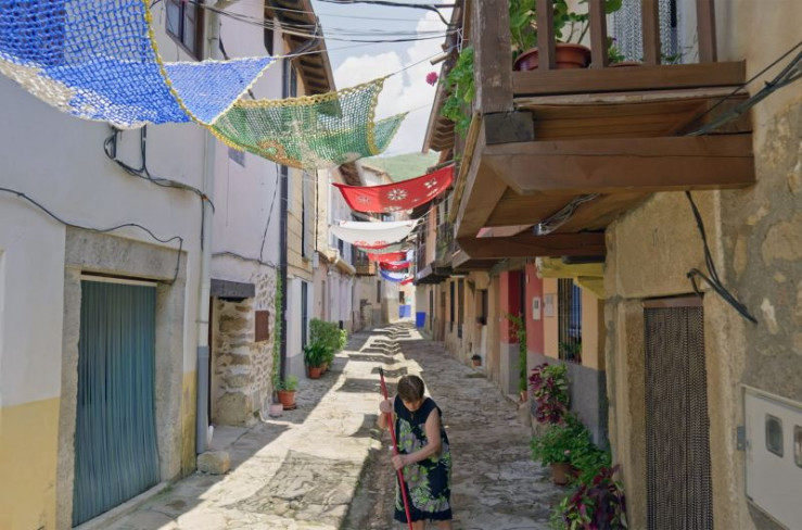 Tejiendo la Calle ? "die Straße überweben": Die schattenspendenden Tücher sind von Hand gemacht und halten die Gemeinde in Valverde de la Vera zusammen.