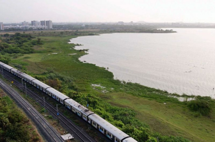 Bahnstrecke nach Rameswaram hinter Chennai am Kolavai-See