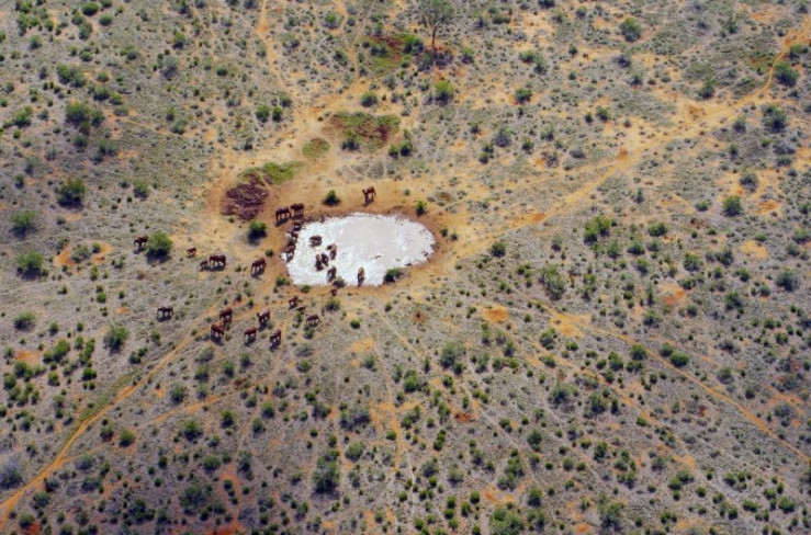 Ein durch die Trockenzeit schrumpfendes Wasserloch aus der Vogelperspektive ? gut zu erkennen sind die Pfade der Elefanten, die aus allen Richtungen auf das Wasserloch zulaufen.
