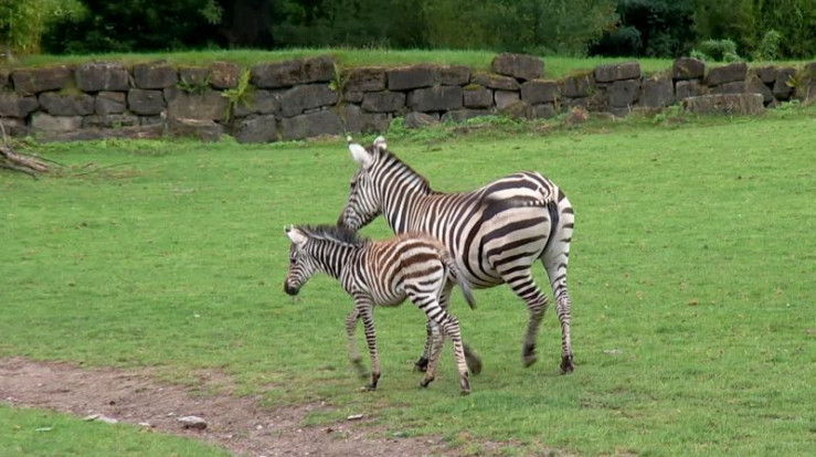 Zebra Nike aus dem Frankfurter Zoo hat scheinbar nichts gegen eine Schrubbeinheit von Pfleger Walter Arlt.