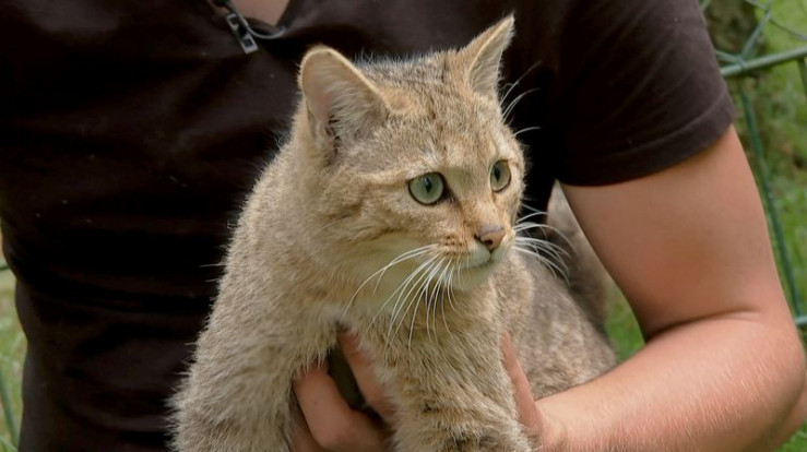Die Wildkatze King Kong im Arm des Pflegers Florian Rimpler vom Opel-Zoo Kronberg.