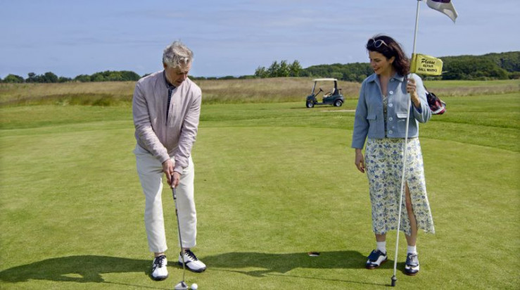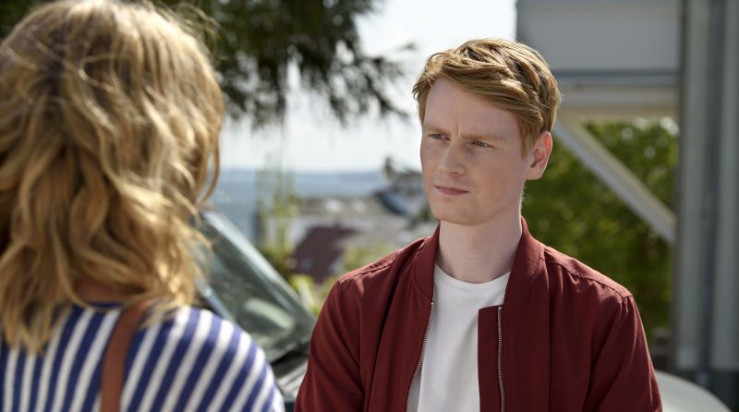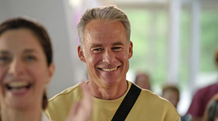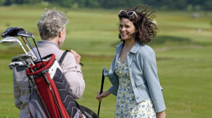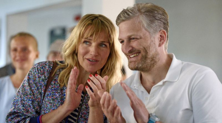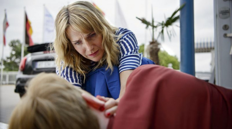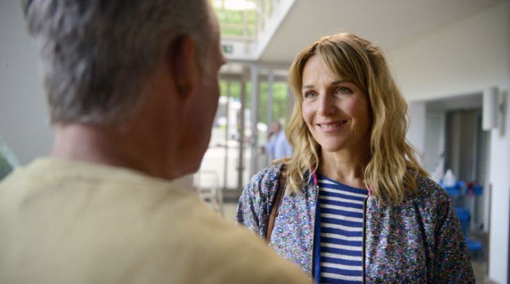 Nora Kaminski (Tanja Wedhorn, li.) und Peer Kaminski (Dirk Borchardt) verabschieden sich von Sophie Trafeur (Maxine Kazis, re.) vor dem Hotel