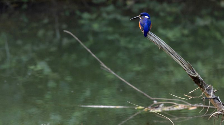 Der Azurfischer schlägt seine Beute gegen den Ast und verschlingt sie anschließend mit dem Kopf voran.