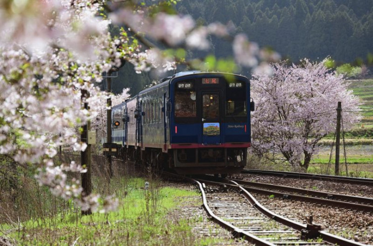 Ein Zug der Noto Railway auf der Halbinsel Noto: Die Strecke ist von blühenden Kirschbäumen gesäumt.