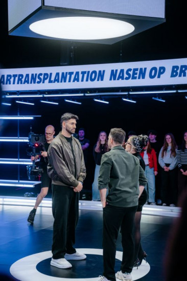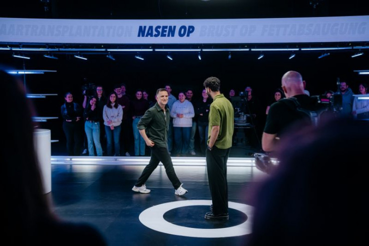 In der Gameshow "Neo Match up" tritt Parshad Esmaeili (l.) gegen Özcan Co?ar (M.) an und muss fünf Kandidaten und Kandidatinnen die richtige Beauty OP zuordnen.