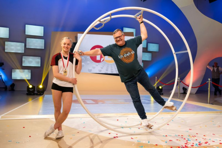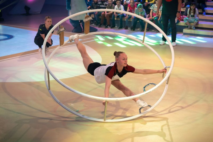 Bei "1, 2 oder 3" dreht sich alles ums ... Drehen! Hoffentlich wird Elton nicht schwindelig, wenn Rhönrad-Juniorenweltmeisterin Lea Gmeiner im Studio ihre Kür zeigt.