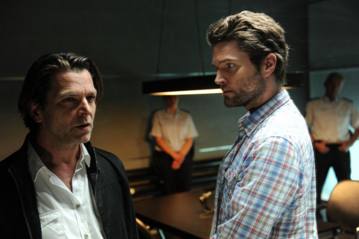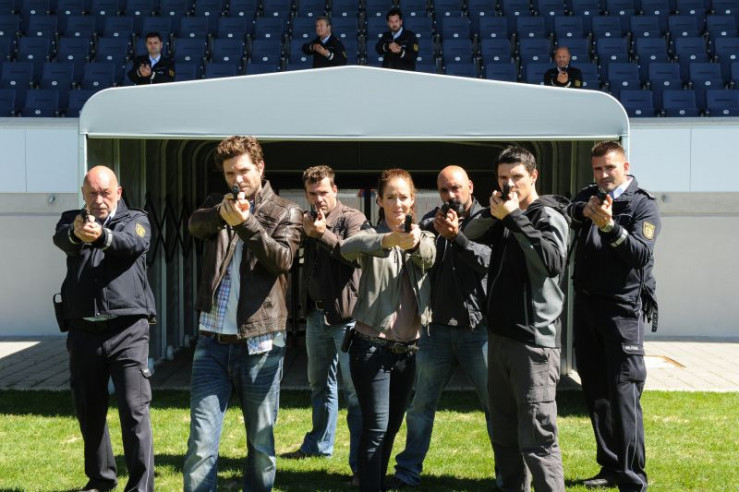 Gerade noch rechtzeitig schaffen es Jo Stoll (Peter Ketnath, 2.v.l.), Selma Kirsch (Yve Burbach, M.), Rico Sander (Benjamin Strecker, 2.v.r.) und weitere Polizisten, einen weiteren Mord zu verhindern und lösen somit den Fall.