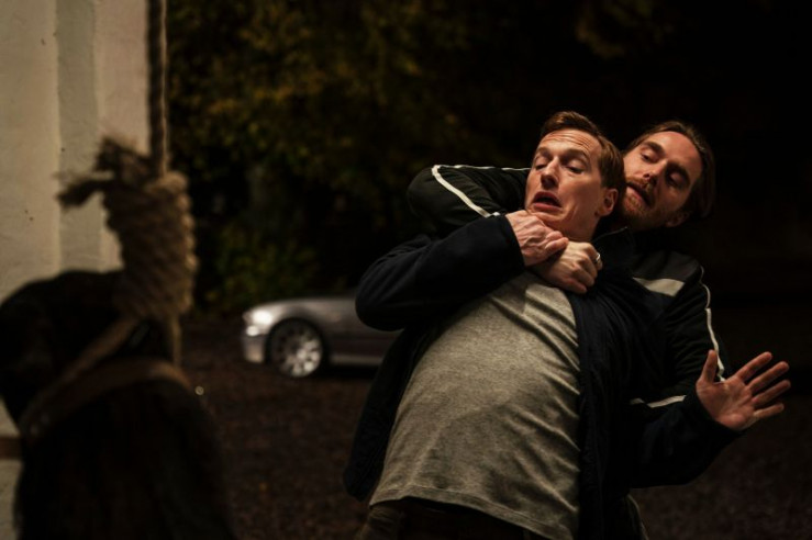 Polizist Grube (Bue Wandahl, r.) und ein Kollege (Komparse, l.) befragen Niels (Jacob Lohmann, M.) zum Tod des Schlossbesitzers Corfitzen.