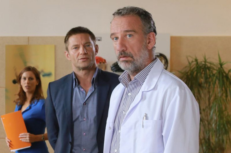 Die Kommissare Korbinian Hofer (Joseph Hannesschläger, r.) und Sven Hansen (Igor Jeftic, l.) verdächtigen Dr. Behring (Heio von Stetten, M.).
