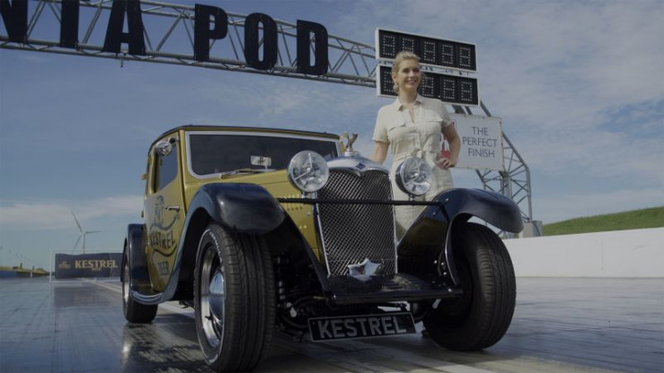 The official press launch of The Flying Kestrel at legendary racetrack, Santa Pod. The Kestrel team is joined by Victor Riley of Riley Cars, and celebrity Rachel Riley.
