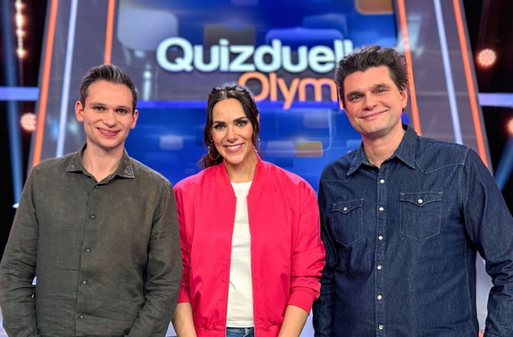 Moderatorin Esther Sedlaczek (M.) mit den Kandidaten des Teams "heute-show": Fabian Köster (l.) und Lutz van der Horst (r.).
