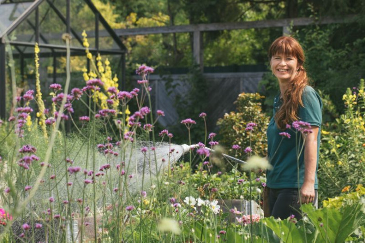 Moderatorin Sabrina Nitsche wässert die Pflanzen im Querbeet-Garten.