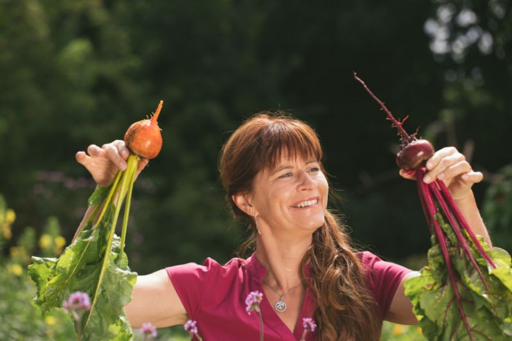 Moderatorin Sabrina Nitsche mit frisch geernteter gelber und roter Bete.