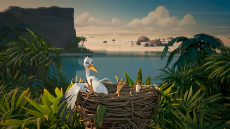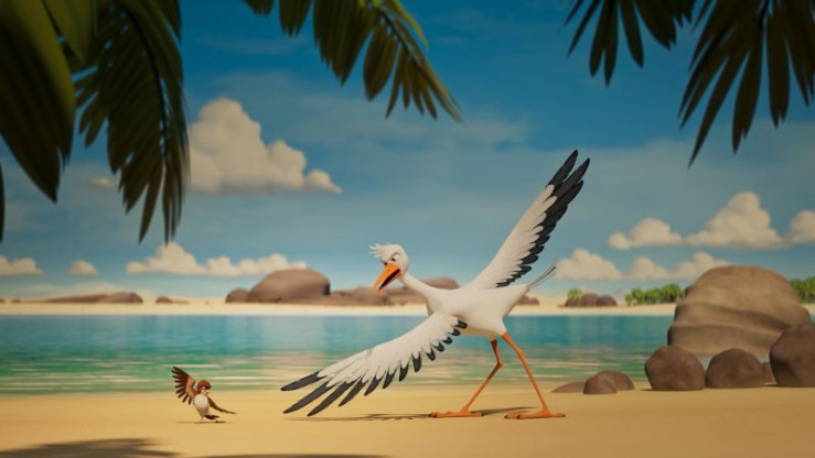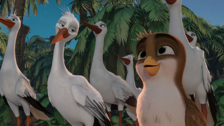Claudius (Storch), Richard (Spatz) und Max (Storch) unterhalten sich am Strand des großen Sees.