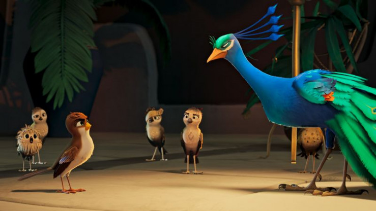 Kiki (Wellensittich), Olga (Eule), Richard, Basak und Samia (Spatzen) stehen in HipHop-Pose als Gruppe zusammen.