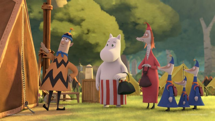 Campingmeister Frisch (li.) ist nie um Eigenlob verlegen und erklärt Muminmama (2.v.li.) und Frau Fillifjonk (3.v.li) die Vorzüge des Zeltens.
