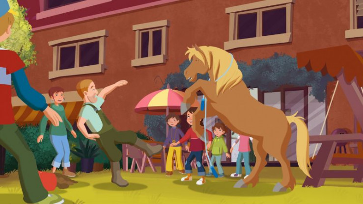 Plötzlich steht der Vierbeiner vergnügt mitten in Taras Garten und sorgt dort natürlich allenthalben für helle Aufregung. Die Kinder sind begeistert, die Voisins empört und Herr Dettke weiß gar nicht, wie das Pferd seine Koppel verlassen konnte.