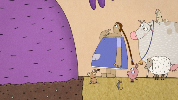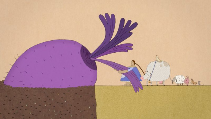 Lena und ihre Tiere betrachten erstaunt das Ergebnis des Düngemittels für Rüben, das ihr der fliegende Händler verkauft hat.