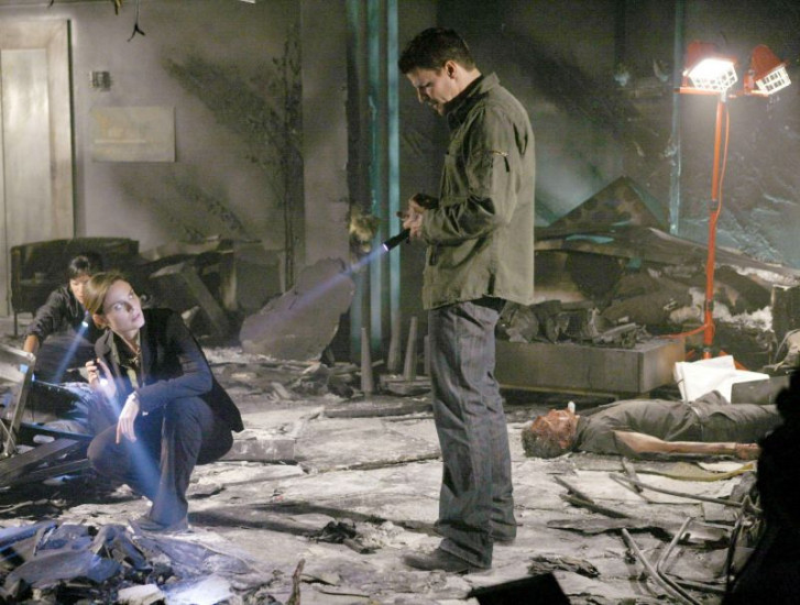Booth (David Boreanaz, r.) und Brennan (Emily Deschanel, l.) untersuchen den Tod einer jungen Kellnerin, die bei einer Explosion auf der Party kolumbianischer Drogenfahnder nur scheinbar zufällig anwesend war.
