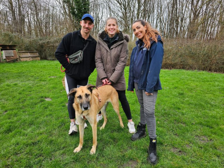 Tom, Nora, Trainerin Ellen Marques (r.) und Schäferhund-Mix "Jay".