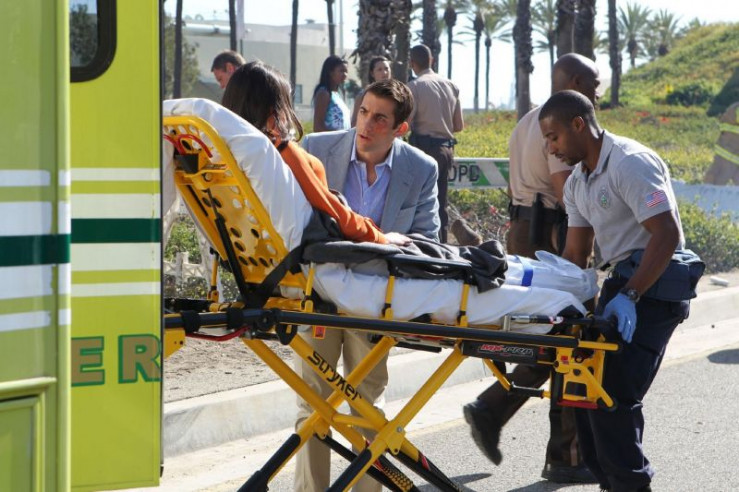 Während die verletzte Sam (Taylor Cole, l.) von Sanitätern zum Transport vorbereitet wird, konfrontiert Ryan (Jonathan Togo, M.) sie mit seinem Verdacht... +++ Die Verwendung des sendungsbezogenen Materials ist nur mit dem Hinweis und Verlinkung auf RTL+ gestattet. +++