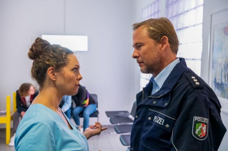 Polizisten Chris Friedrichs (Oliver Clemens) überbringt Ella (Ines Quermann) eine schlechte Nachricht.