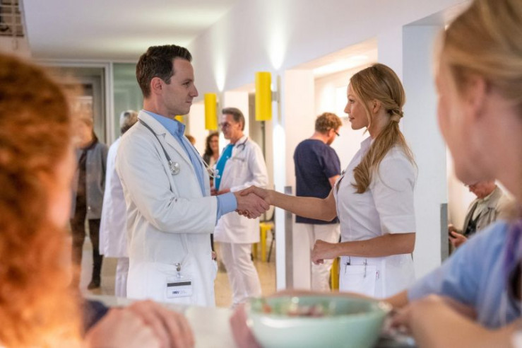 Meike (Sarah Hannemann, l.) und ihre Kollegin Kiki (Valerie Huber, r) beobachten die offensichtliche Turtelei zwischen Dr. Jan Kühnert (Marc Dumitru, 2.v.l.) und der neuen Stationsleitung Nadine (Jana Schölermann, 2.v.r.).