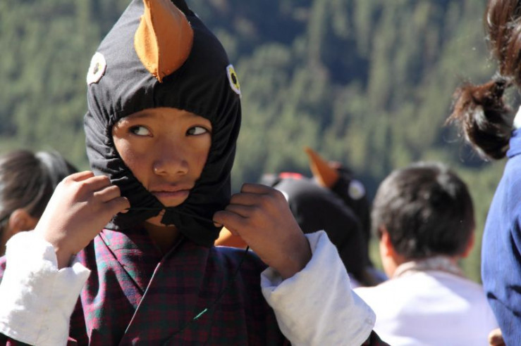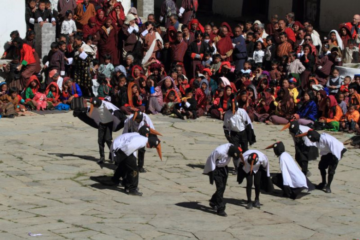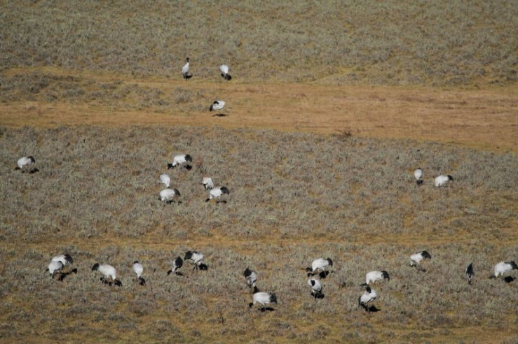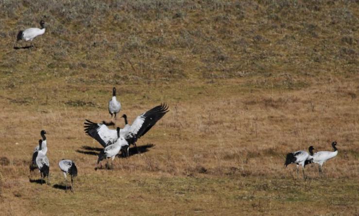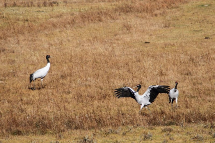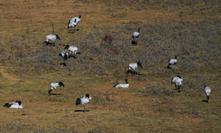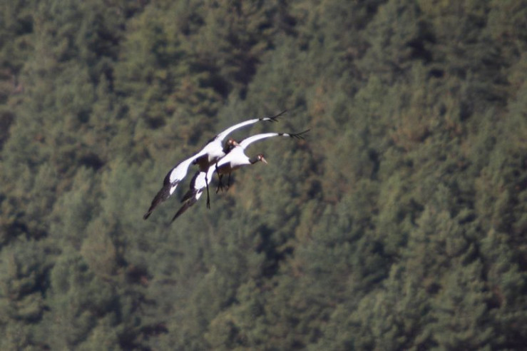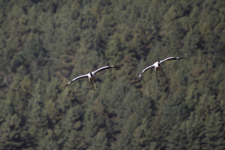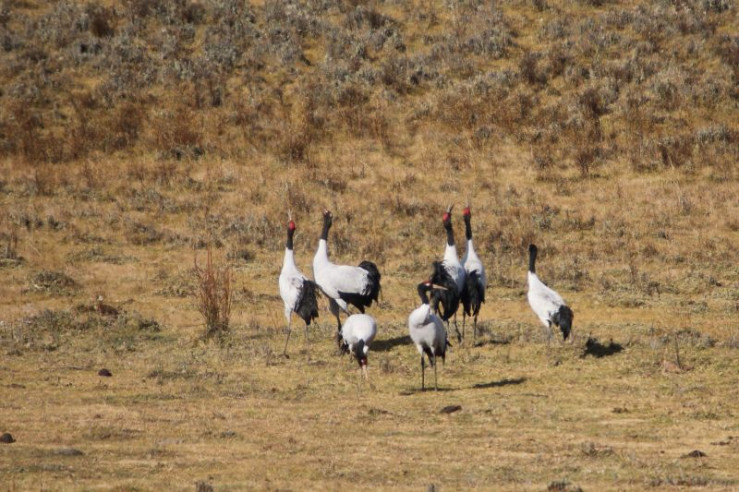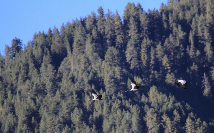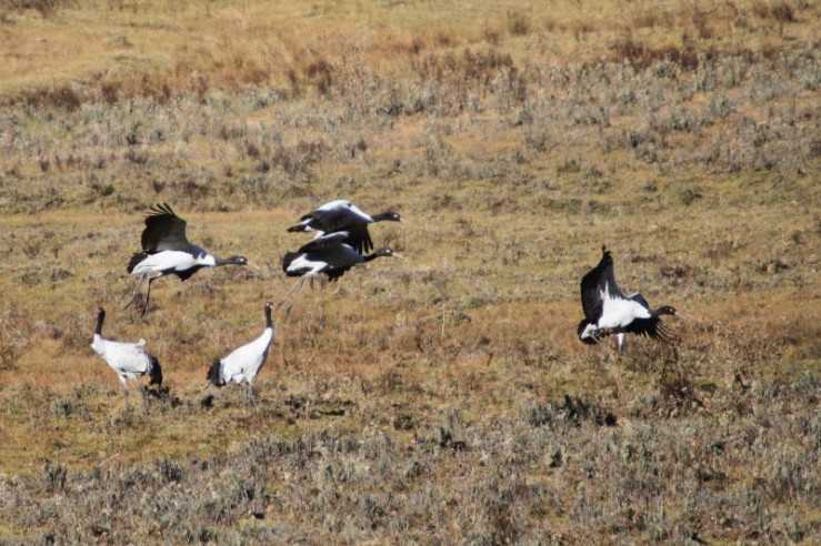 Jedes Jahr im November kommen diese Kraniche vom Tibetischen Hochland über die hohen Gipfel des Himalaya nach Bhutan. In Tibet verbringen die Kraniche den Sommer und ziehen dort ihre Küken groß. Zusammen mit den erwachsenen Vögeln fliegen die Jungen dann ins Phobjikha-Tal, wo sie den gesamten Winter in einem Hochtal auf über 3.000 Meter verbringen.