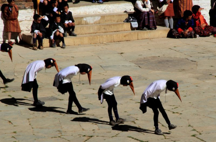 Zur Ankunft der "Heiligen Vögel" feiern die Talbewohner zusammen mit den Mönchen des Tals das Kranich-Fest. Im Kloster Gompa über dem Tal feiern Jung und Alt einen Tag lang die Ankunft - mit Tänzen, die den Kranichen nachempfunden sind. Auch der junge Karma ist bei diesen Feierlichkeiten dabei.