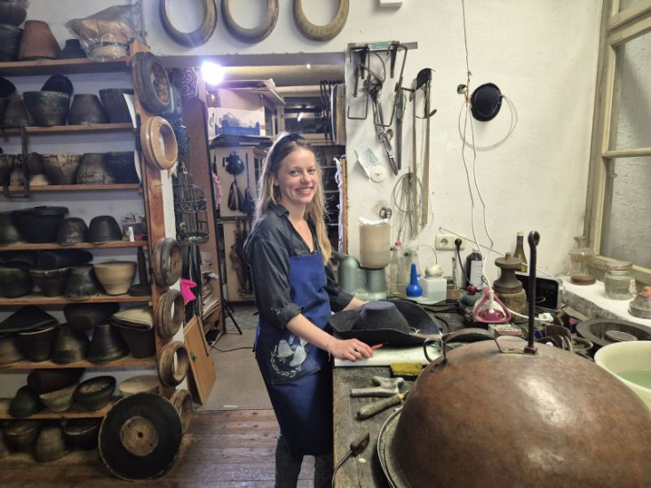 Hutmacherin Marietta Gollé vom "Hut-Schätz" in Tegernsee in ihrer Werkstatt.