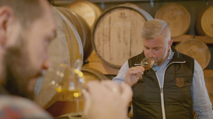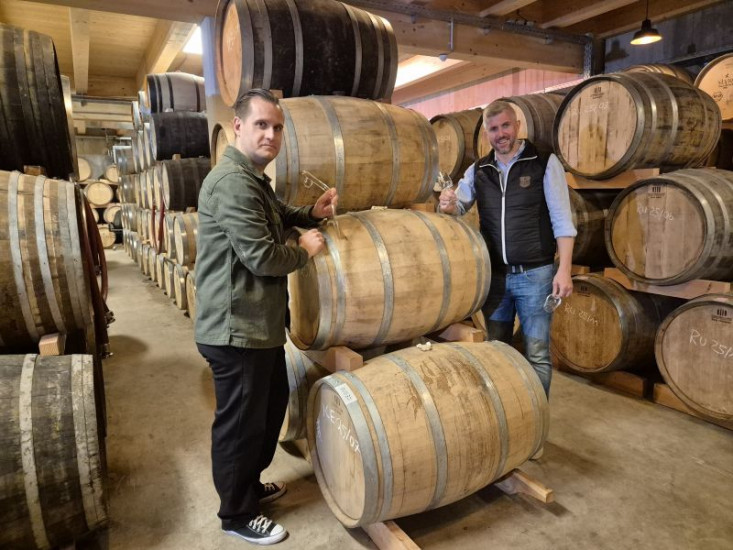 Destillateur Kilian Jonscher und Geschäftsführer Hans Kemenata (rechts) bei der Slyrs-Verkostung.