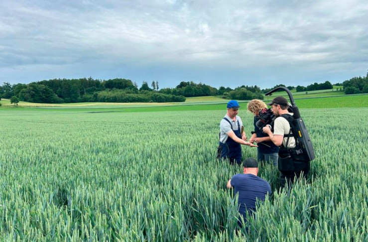 Landwirt Josef Neusäß im Gespräch mit Lena Ganschow begleitet vom Kamerateam.
