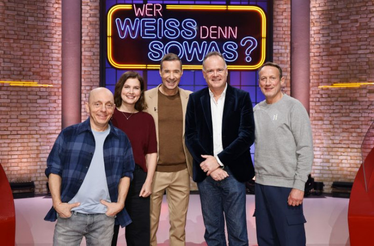 Moderator Kai Pflaume (M.) und seine Rateteam-Kapitäne Bernhard Hoëcker (l.) und Wotan Wilke Möhring (r.) begrüßen in dieser Sendung die Fernsehmoderatorin und Redakteurin Hanna Zimmermann (2.v.l.) und den Journalist und Fernsehmoderator Christian Sievers (2.v.r.).