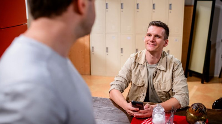 Marlon (Frederik Bott, r.) freut sich, dass sich Fritz (Thimo Meitner, l.) und Lale geküsst haben.