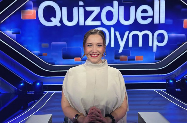 Moderatorin Esther Sedlaczek (M.) mit den Kandidaten des Teams "Sport": Rebecca Mir (l.) und Massimo Sinató (r.)