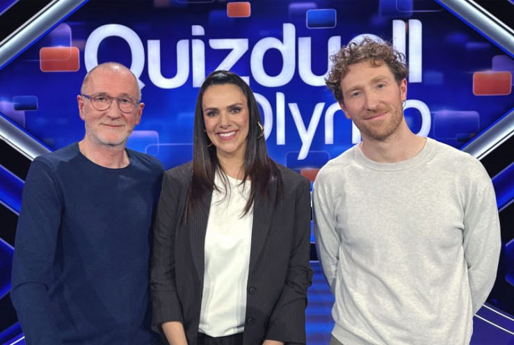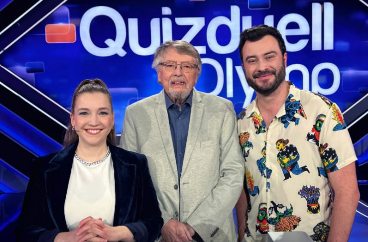 Moderatorin Esther Sedlaczek (M.) mit den Kandidaten des Teams "Wissen": Mirko Drotschmann (l.) und Jasmina Neudecker (r.)