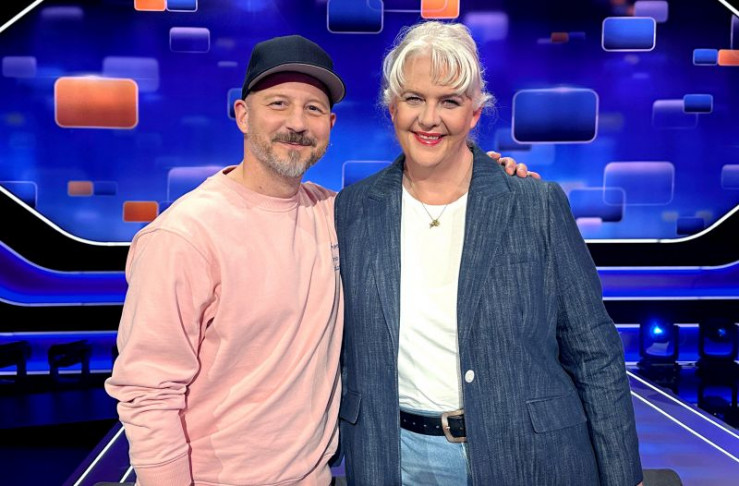 Moderatorin Esther Sedlaczek (M.) mit den Kandidaten des Teams "Komik": Olli Dittrich (l.) und Cordula Stratmann (r.)