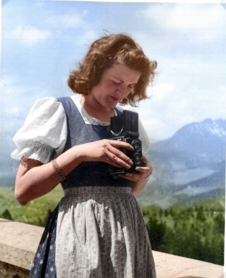 Über zwölf Jahre hinweg fotografiert und filmt Eva Braun das Leben von Hitlers engstem Zirkel auf dem bayerischen Obersalzberg. (Kolorierte Aufnahme).