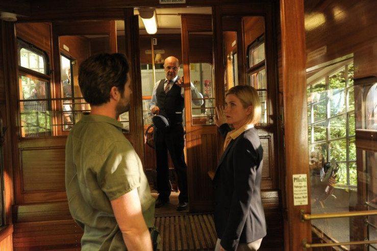 Aufmerksam beobachtet Xaver Brunner (Thomas Meinhardt) von seinem Seilbahnwagon aus das Geschehen am Waldfriedhof.