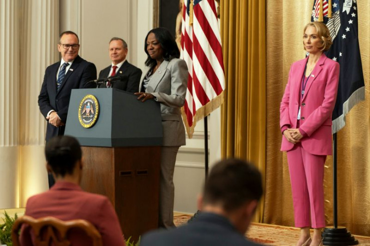 US-Präsidentin Danielle Sutton (Viola Davis) spricht bei einer Pressekonferenz zu Journalisten.