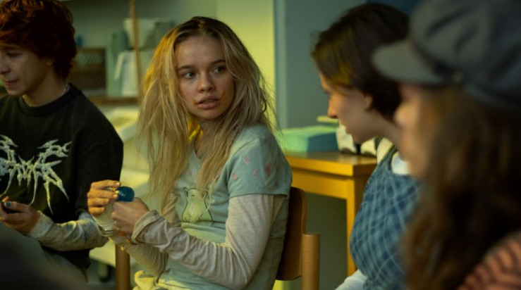 V.li n.re.: Joshua (Elias Tetzner), Michelle (Katharina Hirschberg), Marthe (Iris Leute) und Charlie (Josefine Stern) in der Stuhlkreis-Runde nach der Party.