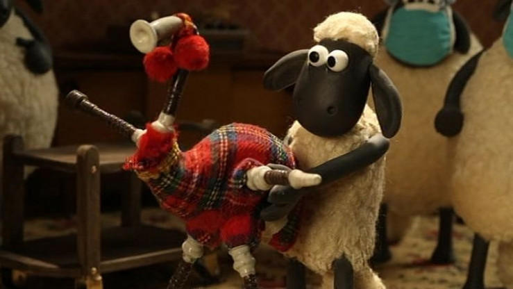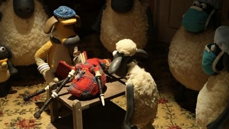 Die Schafe entdecken einen Dudelsack, den sie für ein seltsames Tier halten.