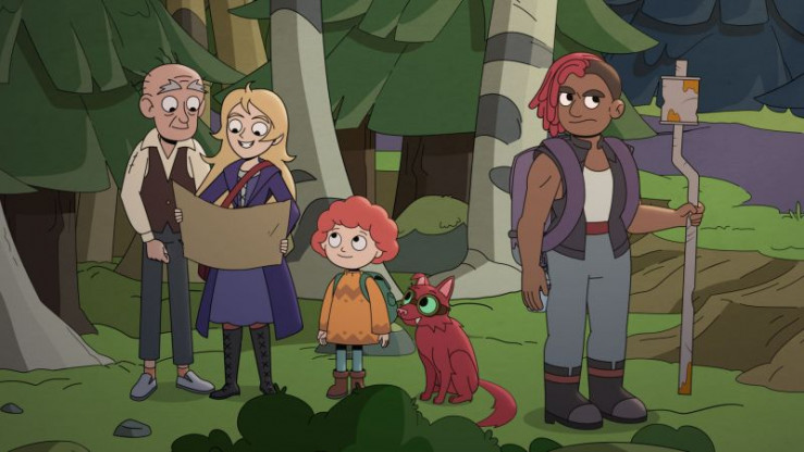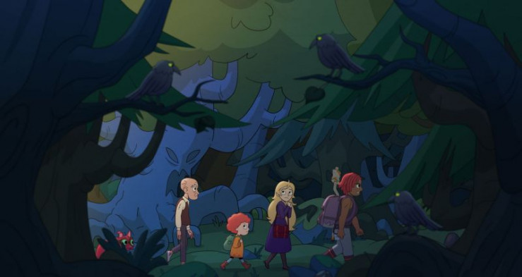 Albert, Ormhildur, Gudrun und Brunhid laufen durch den düsteren Wald des Rabenkönigs