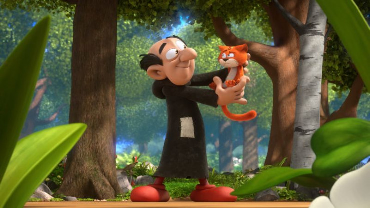 Gargamel hat Azrael ein Amulett auf die Stirn geklebt, mit dem der Kater fliegen kann.