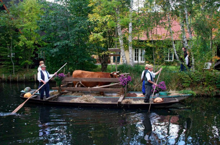 Der Kahnkorso im Herbst ist das größte Fest im Spreewaldort Lehde. Die Kähne sind bunt geschmückt und viele Einwohner tragen die sorbische Festtracht.