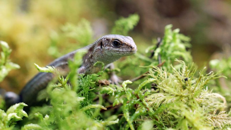 Mooreidechse: Die feuchtigkeitsliebende Mooreidechse beim Trinken von Morgentau.