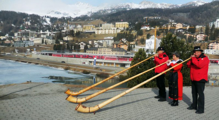 Hier bläst Hans Peter Danuser ins Alphorn. Der ehemalige Kurdirektor von St. Moritz hat schon in den 1980er-Jahren in New York mit dem Alphorn für den "Glacier Express" geworben. Schon bald hinter St. Moritz fährt der Zug durch den Albulatunnel. Auf der anderen Seite geht es bis Thusis bergab auf einem UNESCO-Weltkulturerbe, der Albulalinie.