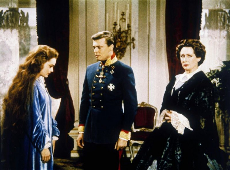 Wildfang Sissi muß sich erst noch an das Leben am Wiener Hof gewöhnen. Doch ihr "Franzl" verteidigt sie gegen die Erzherzogin v.l.: Sissi (Romy Schneider), Kaiser Franz Joseph (Karlheinz Böhm), Erzherzogin (Vilma Degischer)