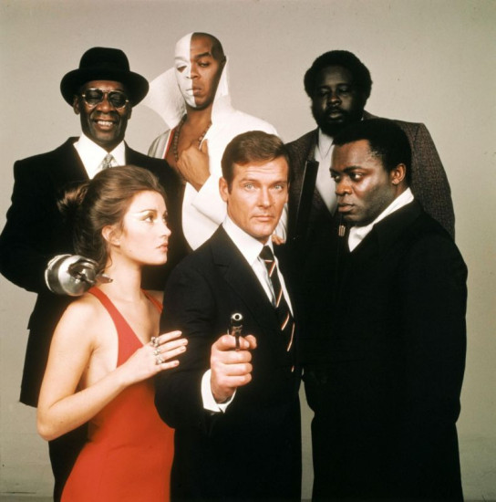 V.h.l.: Tee Hee (Julius W. Harris), Samedi (Geoffrey Holder), Whisper (Earl Jolly Brown); V.v.l.: Solitaire (Jane Seymour), James Bond (Roger Moore), Kananga/Big (Yaphet Kotto)